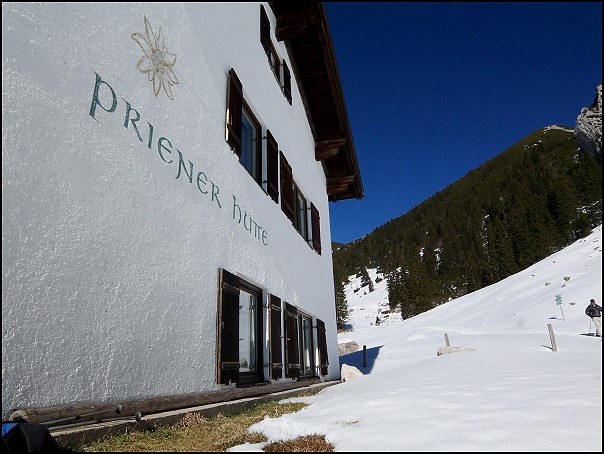 Nach nur 1 ¾ Stunden erreichten wir schließlich unser erstes Ziel: Die Priener Hütte auf 1410 m. Die Aussicht von hier oben war unbeschreiblich. Wir setzten uns auf die Terrasse in die Sonne und genossen einen leckeren Schweizer Wurstsalat mit Blick auf den Wilden Kaiser. Nach und nach strömten jedoch die Ausflügler herein und trotz netten Gesprächen wurde es nach eineinhalb Stunden schließlich (leider) ungemütlich, weshalb wir uns wieder auf den Weg machten.