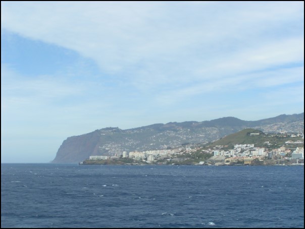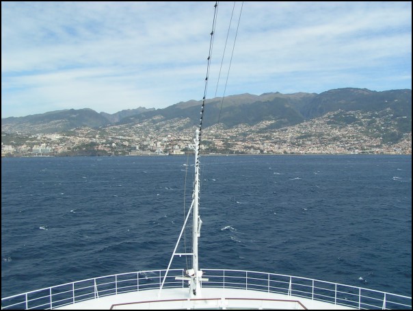 Wieder voll fit und glücklich geht's auf's Pooldeck, wo sich gerade die Crew der AIDA inkl. Kapitän (siehe Foto) vorstellt. Wir verziehen uns mit Rüdiger und Annette in ein entlegenes Eck und warten auf das Anlegen in Funchal. Das Schiff hat den Motor schon abgestellt und wartet auf die Freigabe für den Hafen. Hier - direkt unter der Brücke - sind nur wenige andere Leute unterwegs und somit ist es recht ruhig. Aufgrund einer viel zu großen Welle dauert das Anlegen jedoch viel länger als geplant und der Kapitän ist gut eine halbe Stunde länger damit beschäftigt. Doch um 13 Uhr haben wir's endlich geschafft ... die Aussicht auf die Stadt ist herrlich!