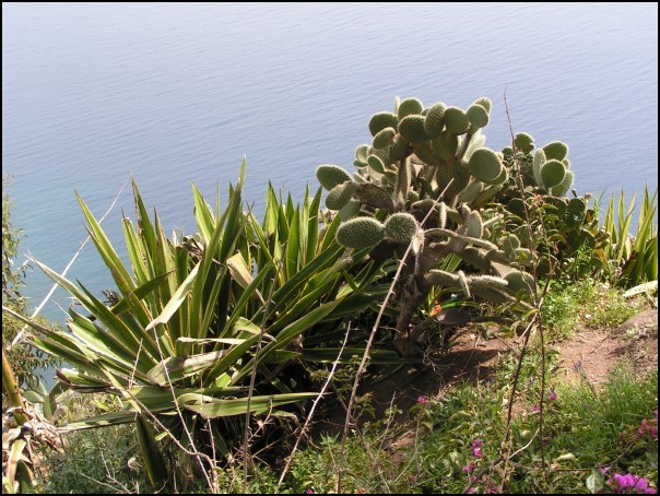 Nacht gut 1,5 Stunden geht's zum nächsten und letzten Aussichtspunkt: Cabo Girão. Diese Steilklippe gilt mit 580 m als die höchste Europas und die zweithöchste der Welt. Von der Plattform aus blicken wir hinunter auf einen nicht zugänglichen handtuchbreiten Kiesstrand. Selbst hier - an einem schwindelerregenden Hang - haben die Bauern winzige Terrassenfelder angelegt, auf denen sie Bananen und Gemüse ziehen und sich dazu mit Seilen herunter lassen. Denn nur so sind diese Terrassenfelder erreichbar. Jeder nur erdenkliche Platz wird hier genutzt - ungeachtet dessen, wie schwierig es ist, diesen zu erreichen. Hier an diesem Aussichtspunkt erblicke ich plötzlich eine Echse und nach und nach werden es immer mehr, bis sich ein kleines Rudel zusammen tut. Daneben und dazwischen entdecken wir wunderschöne Agaven.
