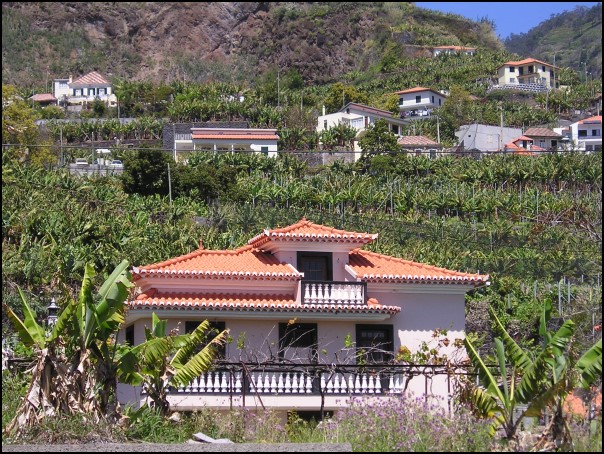 Da es inzwischen schon fast Abend ist, fahren wir wieder langsam zurück zum Hafen. Wir nehmen eine landschaftlich sehr schöne Strecke, die immer wieder durch Tunnels führt, über und neben denen kleine Wasserfälle ins Meer stürzen. Ponta do Sol ist ein sehr freundliches Dorf, dessen Kirche Nossa Senhora da Luz die typisch portugiesischen Häuser überragt. Wir steigen aus, spazieren ein Stückchen durch den Ort und erblicken rundherum nichts als Bananenplantagen. Ein schönes Bild.