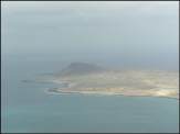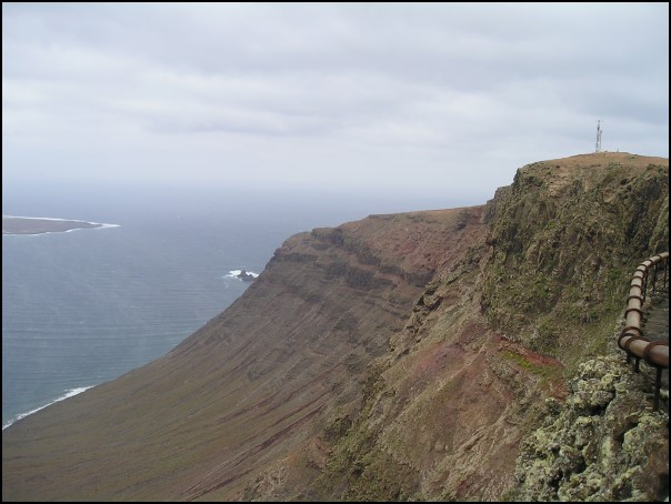 Trotz des recht heftigen Windes hier oben (wir sind auf 475 m) wagen wir uns auf die äußere Plattform, spazieren die engen und verwinkelten Wege entlang und haben eine wunderschöne Sicht auf die Steilküste und auf La Graciosa mit ihrer Stadt Caleto del Sebo und vielen kleineren Erhebungen; Vulkane mit trichterförmigen Öffnungen. Obwohl es etwas wolkenverhangen ist, können wir die Insel in ihrer ganzen Pracht bestaunen.