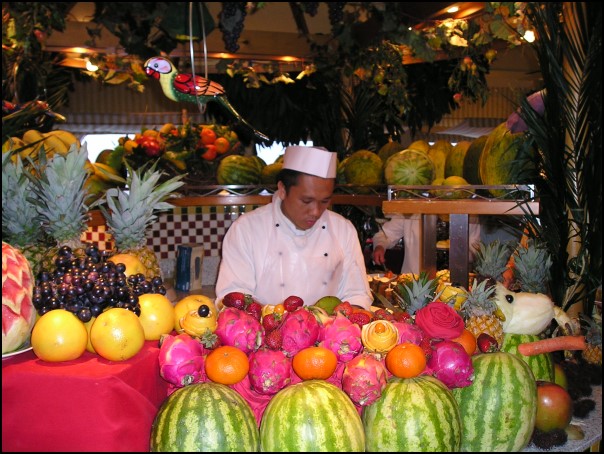 Das Büffet ist riesig und anfangs finde ich gar nicht das, was ich eigentlich suche. Würde man von allem nehmen, bräuchte man mit Sicherheit kein Mittagessen mehr ... ;-) Die Leute hier krachen immer wieder leicht zusammen - das Schiff wackelt fürchterlich. Ich bediene mich reichlich am Obst-Büffet und finde Früchte vor, die es bei uns gar nicht gibt. Wie schön, dass man hier alles mal probieren kann! Selbst an Tees gibt es so gut wie jede Sorte, was man sich nur vorstellen kann. So etwas hab’ ich in noch keinem Hotel erlebt. Ich staune ...