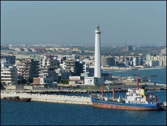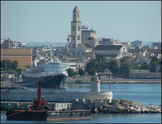 Auf kurz nach 10 Uhr liefen wir schließlich im Hafen von Bari ein. Schon vom Meer aus sah die Stadt nicht sonderlich groß, aber interessant aus. Im Hafengelände lagen uralte, total verrostete Schiffe herum; Schrott, der hier wohl ewig liegen wird, bis er sich verselbstständigt. ;-) Das Einfahren in den Hafen war interessant. Unser Kapitän manövrierte hin und her, fuhr in den Hafen rein und wieder halb heraus … er konnte sich irgendwie nicht richtig entscheiden, wo er denn jetzt hin will. Letzten Endes stand er aber dann doch richtig und bereits kurz nach der Freigabe konnten wir das Schiff verlassen.