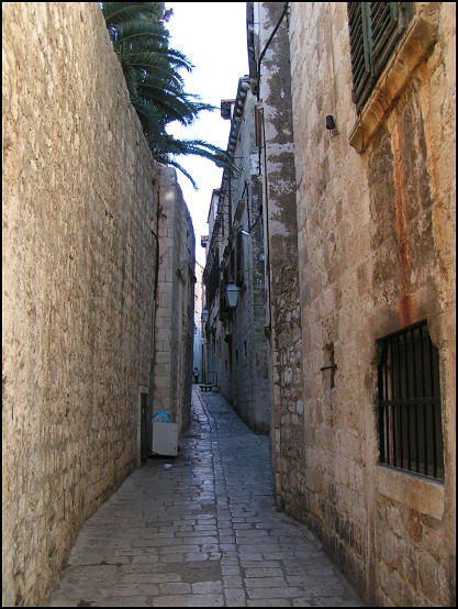 Durch das spitzbogige Seetor hindurch gelangten wir auf die Hauptstraße Placa, die von den Einheimischen aber auch gerne "Stradun" genannt wird. Die Straße verläuft kerzengerade durch die Stadt und verbindet das eine Ende der Altstadt mit dem anderen Ende der Altstadt ohne Unterbrechung. Sie ist die breiteste Straße hier, von der wiederum zig Seitentraßen abgehen und in enge Gassen führen. Besonders beeindruckend fand ich die Steinplatten der Placa. Diese wurden durch Tausende von Jahren so glatt gelaufen, dass diese Steinplatten wie eine spiegelnde Wasserfläche wirken.