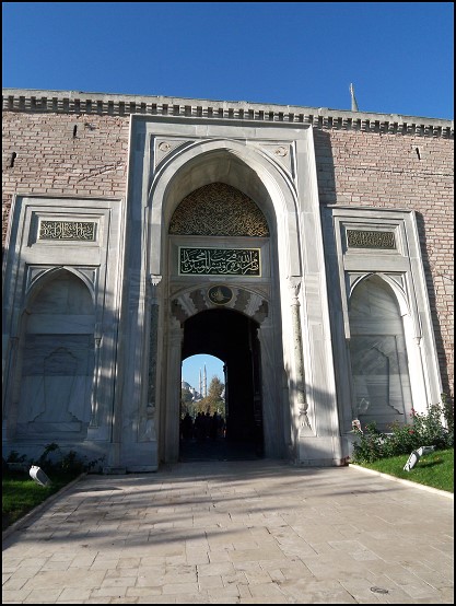 Am Topkapi-Palast angekommen, war überraschenderweise fast nichts los und wir stellten uns in die nur aus rund zehn Besuchern bestehenden Schlange am Ticketschalter an. Hier war es noch so schön ruhig, blauer Himmel war zu sehen und die Sonne strahlte vom Himmel. Mit dem Ticket in der Hand schlenderten wir zum Eingang und mussten erst einmal durch eine Sicherheitskontrolle hindurch. Dort herrschen die gleichen Sicherheitsvorkehrungen wie am Flughafen.