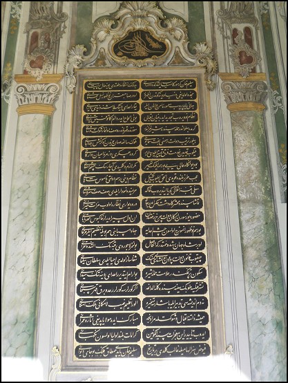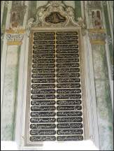 Wir schlenderten durch dieses Museum, das uns wirklich riesig vorkam. Zwar drang auch hier nur wenig Licht in die Räume, aber immerhin war es etwas heller als in der Blauen Moschee. Besonders beeindruckt hat mich in der Tat die Größe und die riesige Kuppel dieser Moschee. Außerdem die runden Schriftetafeln, die in schwindelerregender Höhe angebracht sind und riesig erscheinen. Diese acht Schriftetafeln zeigen auf grünem Grund aus Kamelleder und in goldener Schrift die Namen von Propheten aus dem Islam.