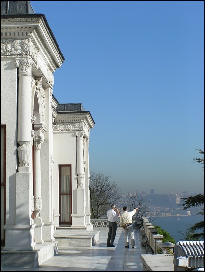 Auf unserem Streifzug durch die Palastanlage kamen wir an vielen wundervollen Gebäuden vorbei und durchschritten viele beeindruckende Tore, wie u. a. das Bab-i-Hümayun-Tor, das Kubbealti, Bagdat Kösk usw. Von einem kleinen Pavillon aus mit glitzerndem Golddach hatten wir einen tollen Blick auf einen Teil Istanbuls sowie auf das Goldene Horn, wo reger Schiffsverkehr herrschte. Erschreckend war dagegen der gut sichtbare Smog, der über der Stadt hing. So etwas hatte ich noch nie gesehen.