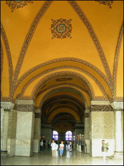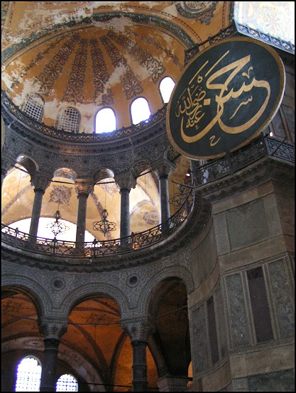 Nachdem wir uns in der gesamten Moschee umgeschaut hatten, stiegen wir zur Empore hoch und waren auf einer Höhe mit den runden Schrifttafeln. Die Emporen der Hagia Sophia waren bei den Byzantinern und den Türken den Frauen vorbehalten. Dort sieht man mehrere Beispiele von Mosaiken, wie z. B. ein Mosaik der Kaiserin Zoe mit ihrem Gatten Konstain IX. und viele weitere.