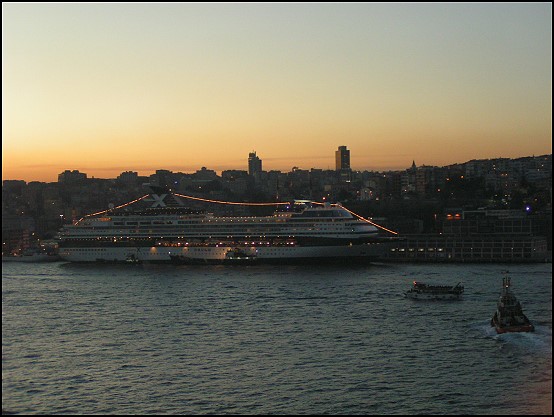 Noch schnell die kurz zuvor angekommene Celebrity "Millennium" sowie die vor uns parkende Hapag Lloyd "Europa" fotografiert, ging es auf die Kabine ... was waren wir geschafft! Die Beine taten höllisch weh! Schon wieder machte sich ein kleiner Hunger breit und wir begaben uns ins Restaurant Prometeo, um die letzten Züge des nachmittäglichen Essens mitzunehmen. Anschließend spazierte ich noch einmal über das Schiff und genoss die Aussicht auf Istanbul. Nun konnte ich den meisten Gebäuden wieder Namen zufügen und sah die Stadt jetzt mit ganz anderen Augen als heute Morgen.