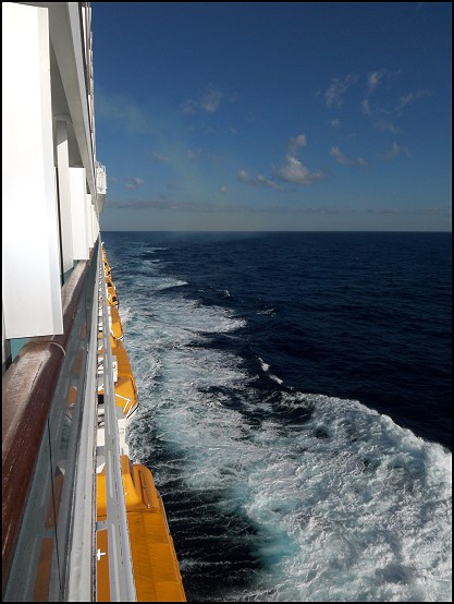 Aber wie es duftete … frische Croissants, frische Semmeln (nicht einmal die typisch harten italienischen Brötchen!), O-Saft, Müsli … Alles, was das Herz begehrt. Bei Sonne pur und vorbeiziehendem Meer genossen wir unser kleines Festmahl auf dem Balkon und freuten uns über diese Reise. Schon heute waren wir uns sicher: Wir hatten das richtige Schiff gewählt; es ist alles wie im Traum. Und zurecht finden werden wir uns auch noch; so schnell kriegt uns das Schiff nicht klein! ;-)