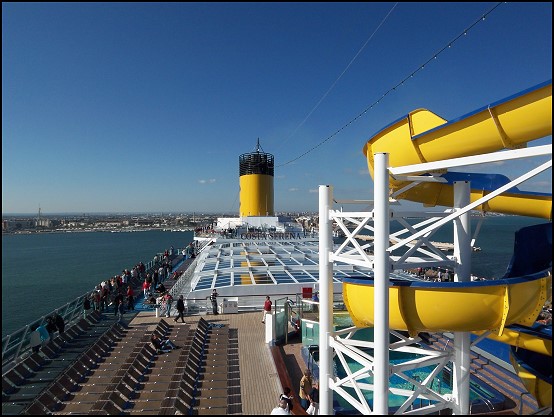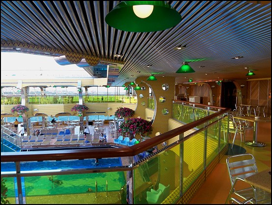 Gut gestärkt schlenderten wir zum Pooldeck. Gestern hatten wir nur einen Teil davon gesehen und es interessierte uns doch sehr, was noch so alles geboten ist. Besonders toll fand ich die Verwinkelungen auf dem Schiff. Es gibt keine einfache große Fläche, die sich von vorne bis hinten durchzieht (wie wir es von den AIDA-Schiffen her kennen), sondern es gibt immer wieder Unterbrechungen anhand von Treppen und man muss das Deck quasi immer mal wieder wechseln, bis man vom einen Ende zum anderen gelangt. Somit wirkt das Schiff irgendwie "verspielter" und "ansprechender". Im übrigen gibt es auf dem gesamten Schiff nur ein Deck, auf welchem man in einem Zug durchgehen kann.