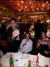 Da abends das zweite und letzte Gala-Diner stattfand, warfen wir uns frühzeitig in Schale. Heute bekamen wir eine spezielle Menükarte, das Essen war nochmal einen Tick feiner als wir es von den vorherigen Tagen gewöhnt waren, und zum Dessert kam schließlich das, wovon ich schon immer "geträumt" habe ... der Einmarsch der Köche mit Torten und Sternwerfer á la "Traumschiff". ;-)