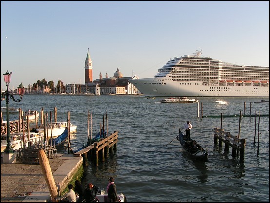 Eigentlich wollten wir uns die Schiffe aus nächster Nähe ansehen, doch in Venedig kommt man da leider nicht so gut ran und so fuhren wir weiter zum Parkhaus Piazzale Roma; direkt am Eingang Venedigs. Als ich die einzelnen Parklücken sah, traf mich fast der Schlag. Die waren so klein, dass wir sogar mit dem Mini erhebliche Schwierigkeiten hatten, einzufahren und auszusteigen! Ich sah mein Auto schon von oben bis unten zerkratzt; aber was hilft’s? Raus fahren können wir nun auch nicht mehr, hier gibt es kaum Parkmöglichkeiten. Also: Augen zu und durch. Wird schon gut gehen. Das einzig Positive an dem Parkhaus war die Sicht auf den Kreuzfahrthafen. Von hier aus kann man die Schiffe in ihrer vollen Pracht bestaunen. :-)