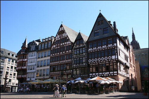 Ein paar Schritte weiter, über die Braubachstraße hinweg, erreichten wir schließlich den bekanntsten Platz Frankfurts – den Römerberg mit dem Römer. Der Anblick dieser Fachwerkhäuser erinnerte mich an einige mittelalterliche Städte im Norden Bayerns und hebt sich schon wirklich sehr vom Rest der Stadt ab. Sehr romantisch.